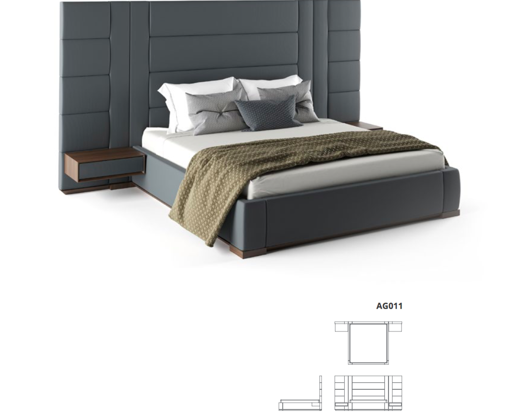 Cama com cabeceira com 2 laterais e base com estrutura em MDF revestidos a espuma e tecido, com detalhes à vista de MDF folheado a nogueira com acabamento de verniz acrílico. Inclui 2 mesinhas com estrutura em MDF folheado a nogueira e frentes forradas a espuma e tecido. Colchão 180 x 200 cm.