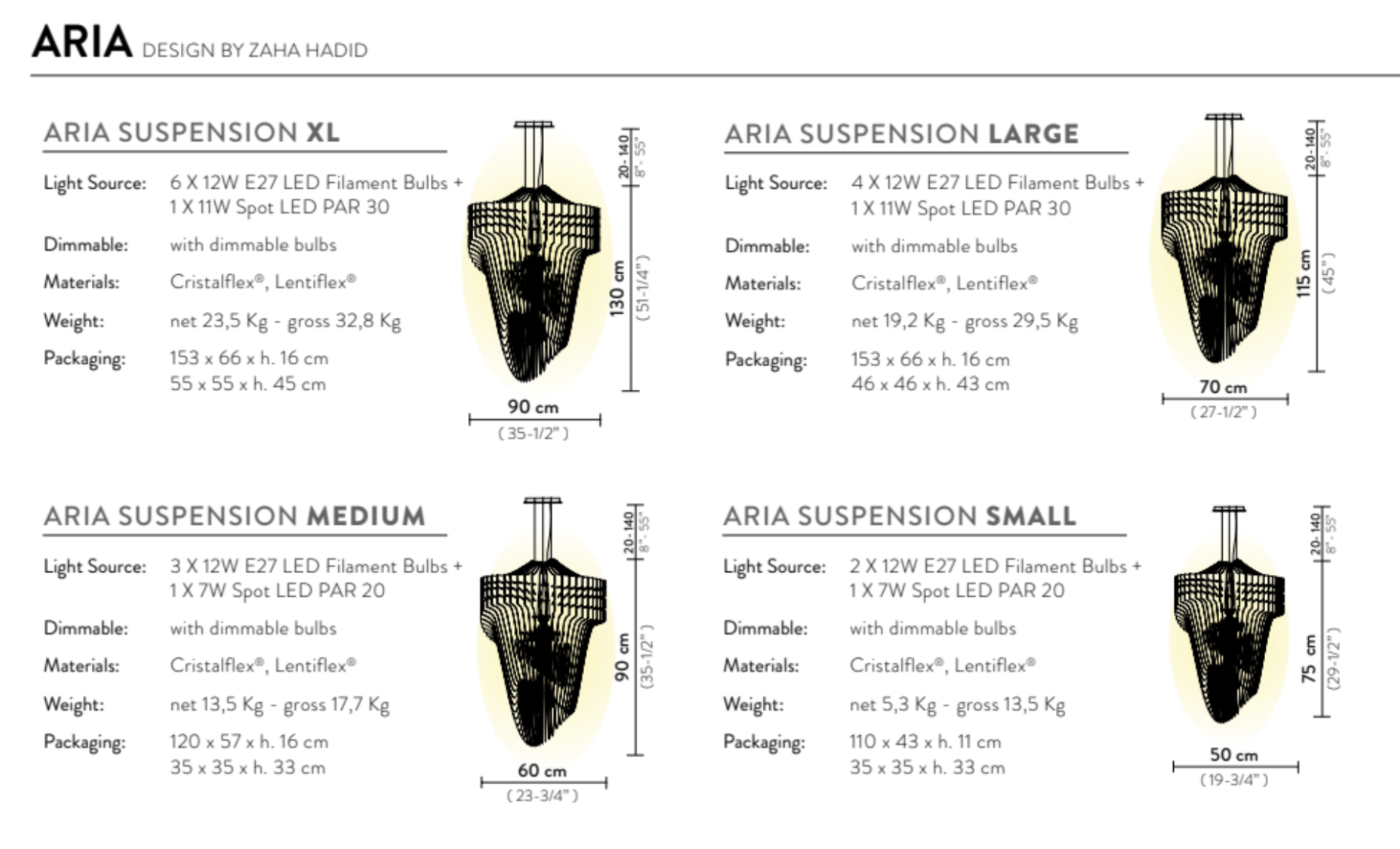 • Quatro lâmpadas ARIA SUSPENSION em diferentes tamanhos, com especificações técnicas e lista de características.
