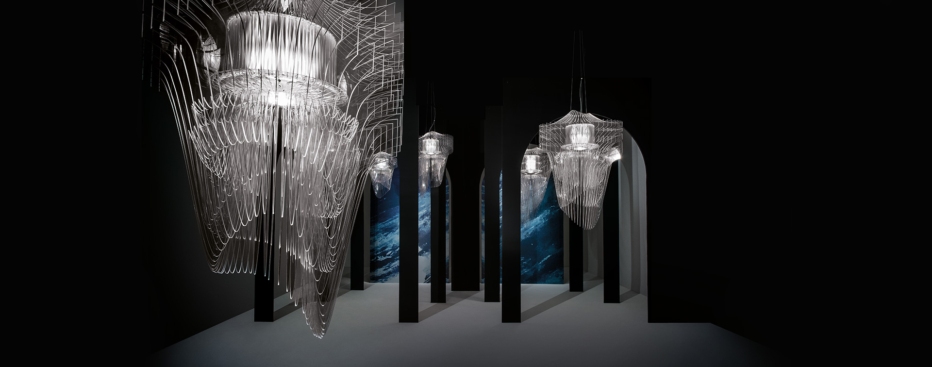 • Esculturas suspensas com fios brancos em postes pretos num ambiente escuro