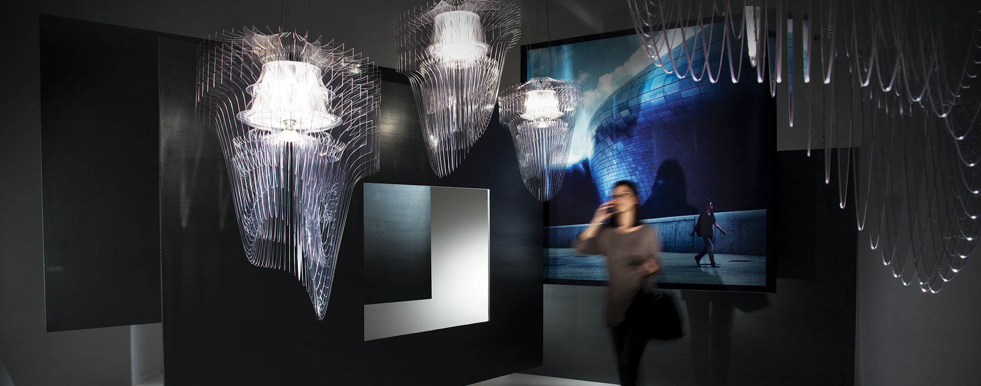 • Instalação luminosa com candeeiros suspensos translúcidos e pessoa em movimento num espaço escuro de exposição