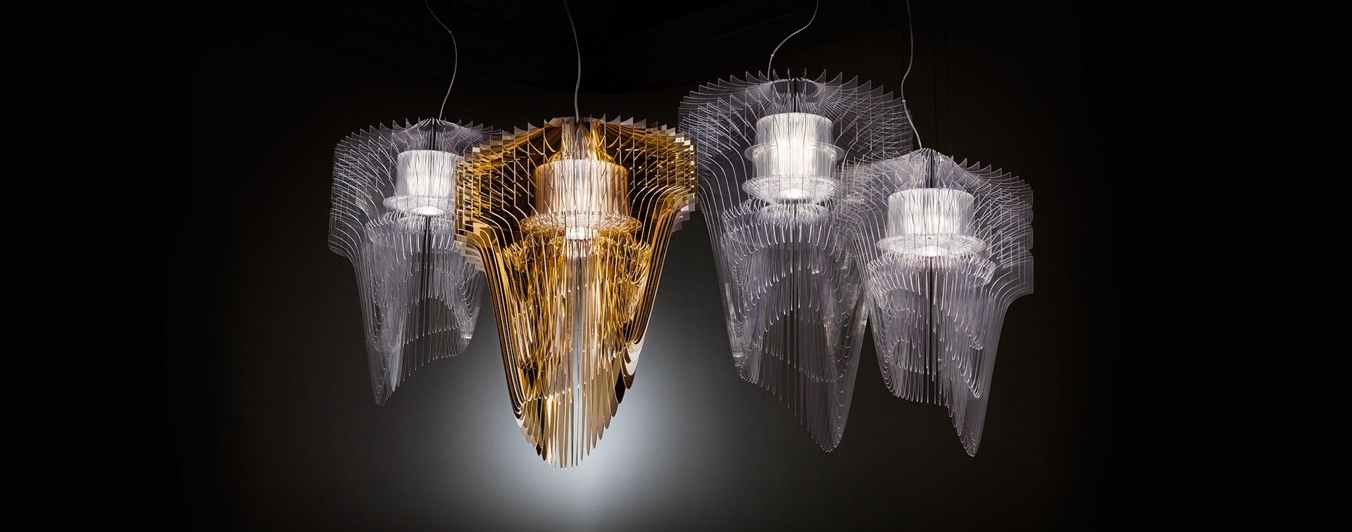 • Quatro candeeiros suspensos modernos em rede, três transparentes e um dourado no centro.