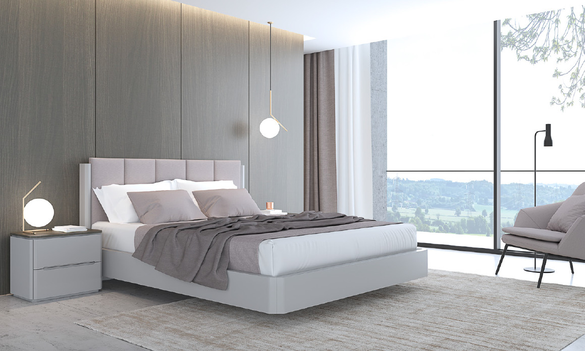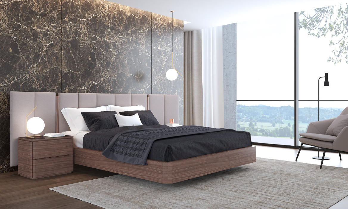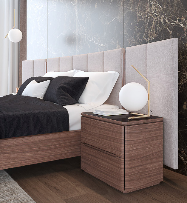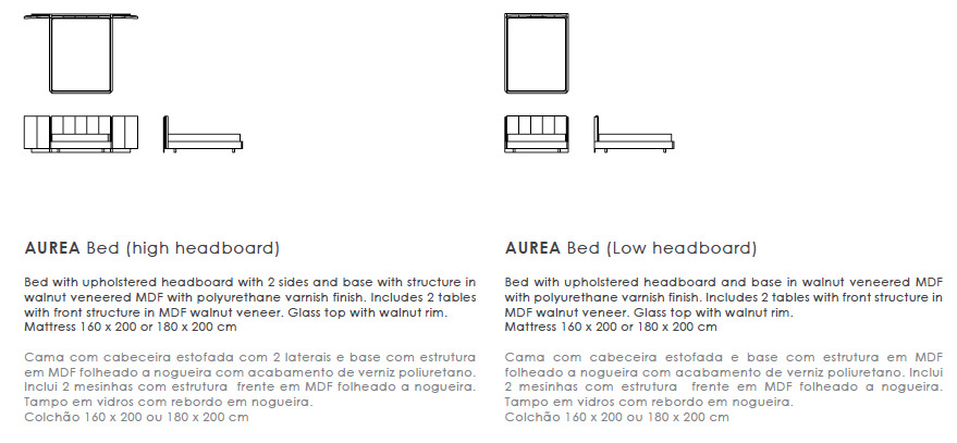 Cama com headboard (cabeceira) disponível em duas versões: standard ou com painéis laterais. Não inclui tecido disponível para escolha em atelier.