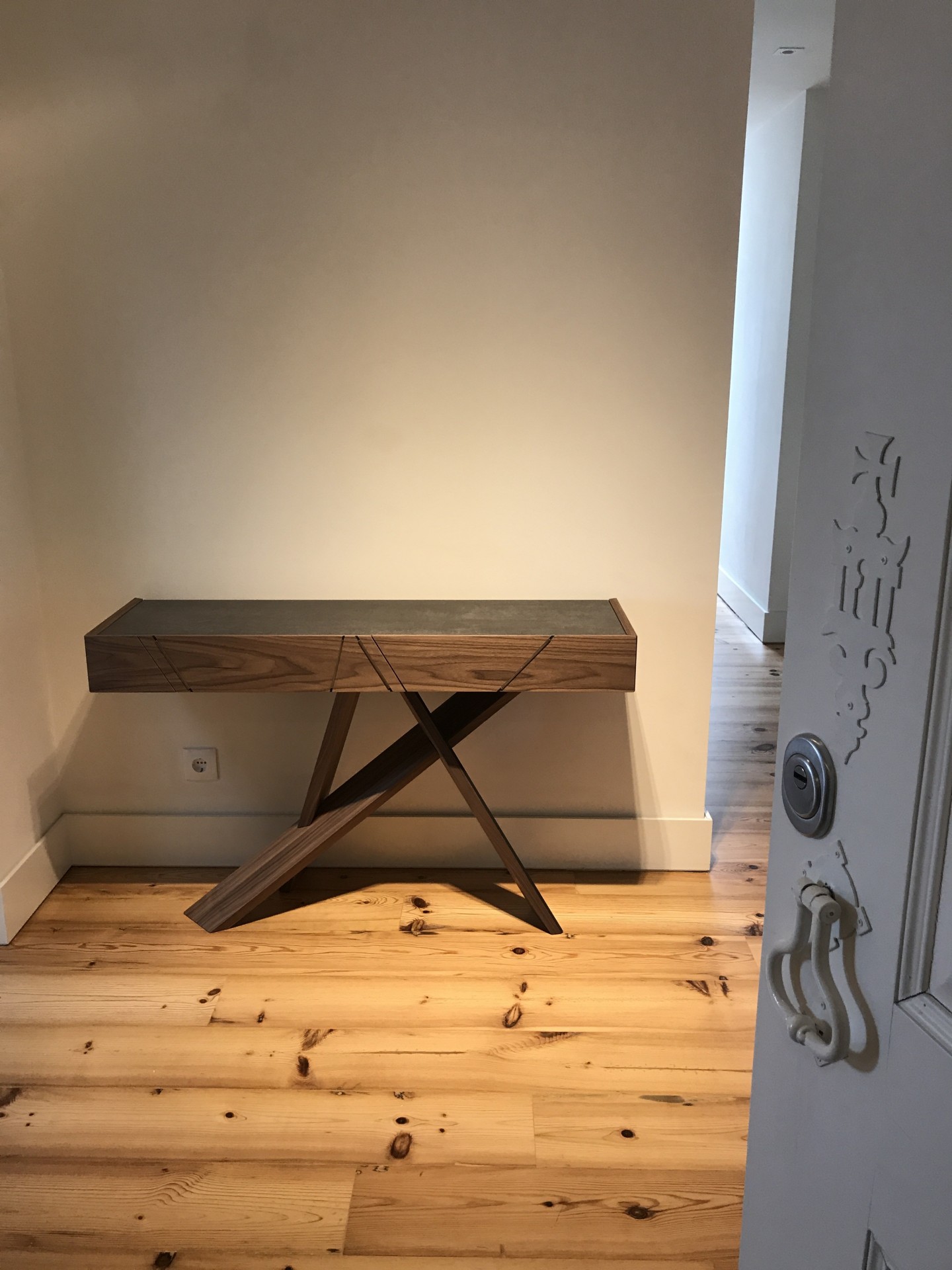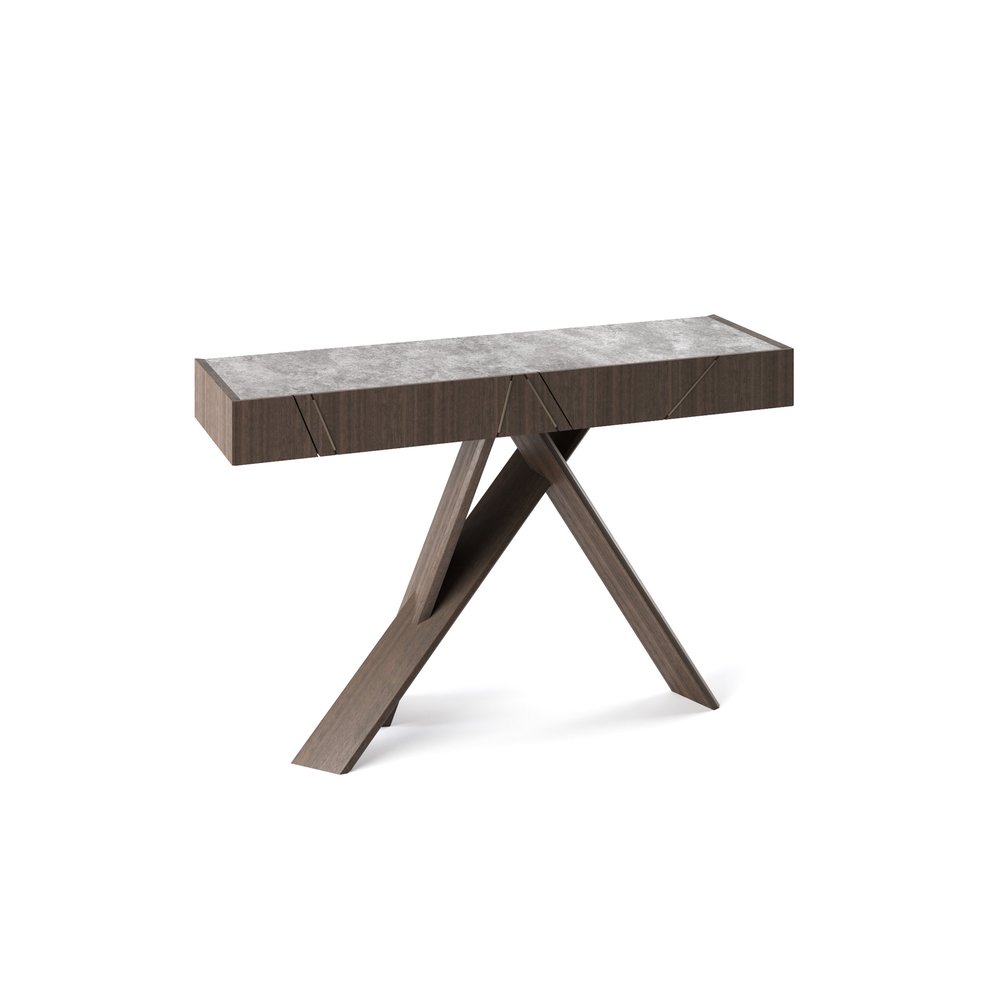 Consola com estrutura em MDF revestido em folha de eucalipto fumado, com 1 gaveta. Aplicações em latão oxidado nas frentes. Pés em madeira de freixo. Acabamento em verniz acrílico. Tampo com revestimento em folha de madeira, vidro lacado ou cerâmica da gama Luxury.