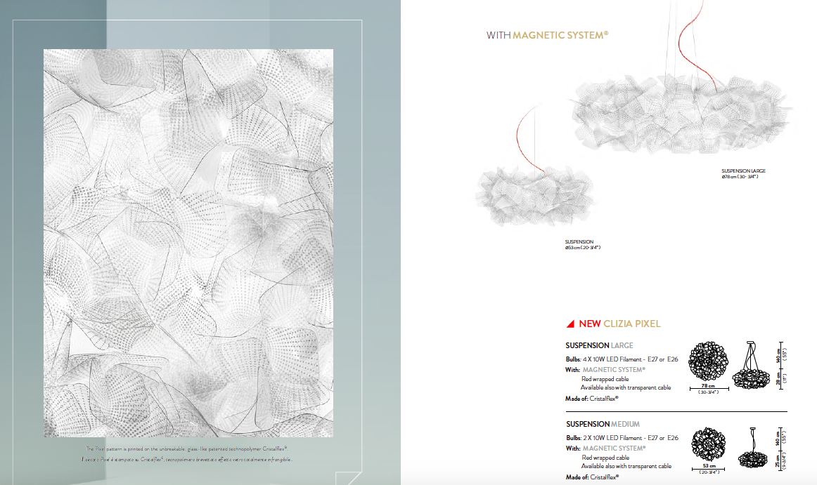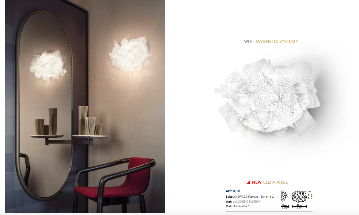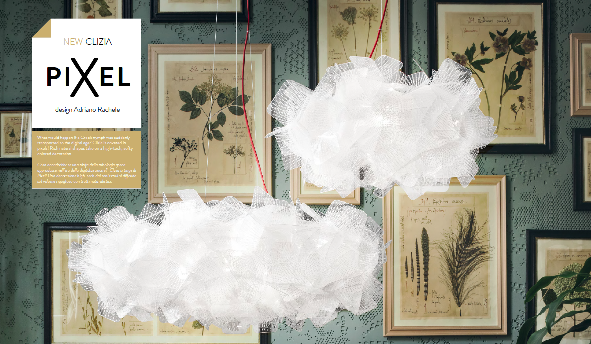 Imagine uma ninfa da mitologia Grega a viver nos dias de hoje numa era digital. O novo CLIZIA está repleto de pixels: um design tecnológico de tons ténues que se estendem por todo o candeeiro. Este candeeiro e os seus tons neutros permitem uma distribuição uniforme de luminosidade.