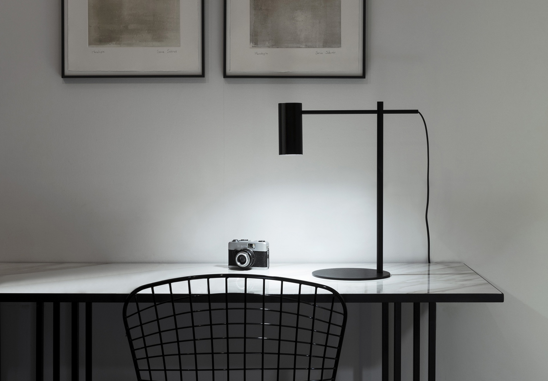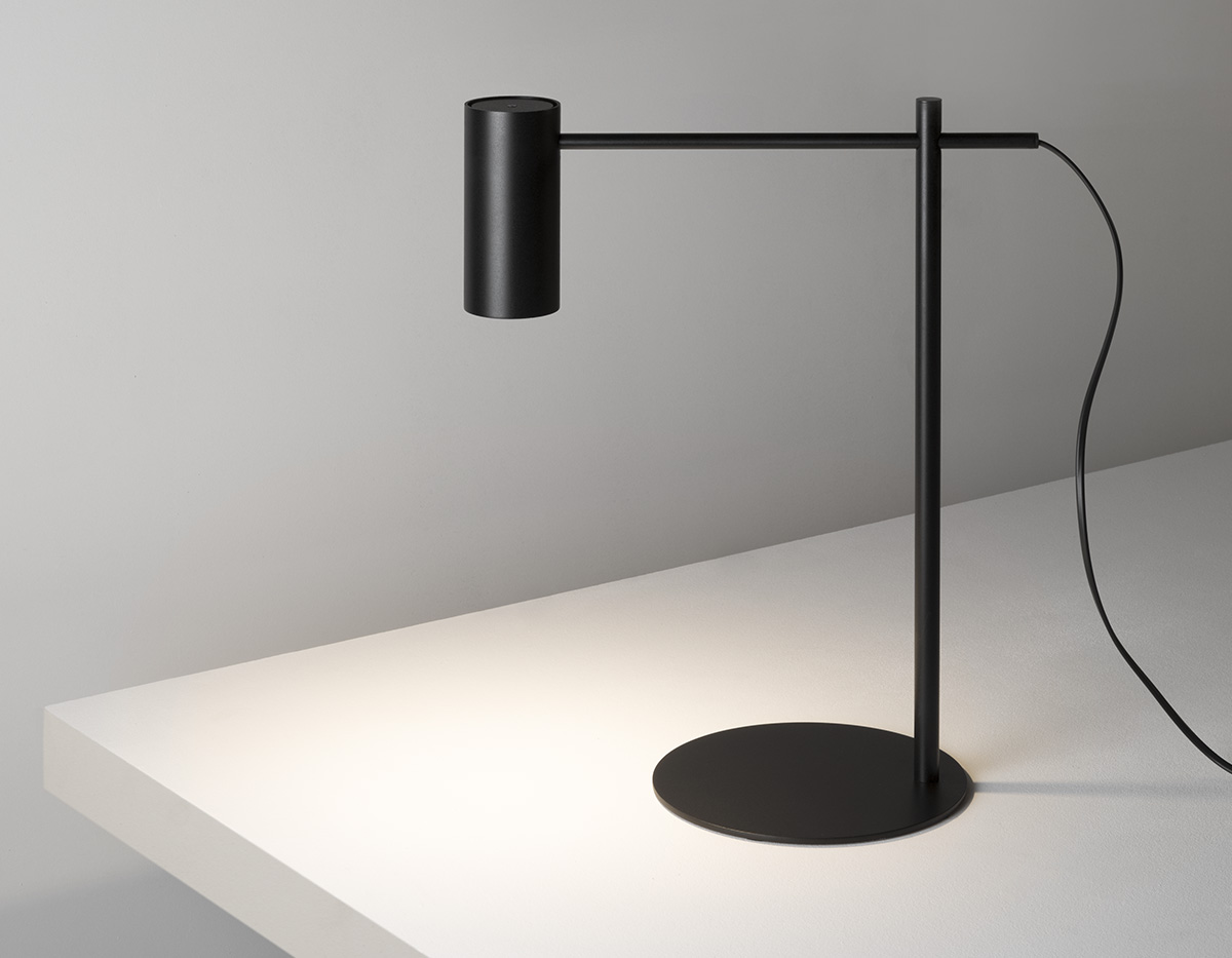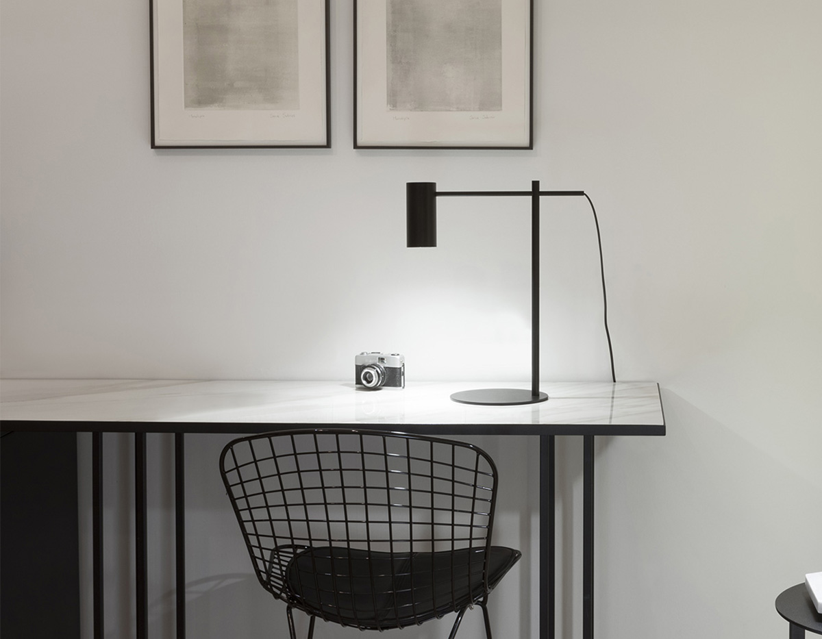 Linhas direitas e minimalistas. Um candeeiro de mesa disponível em negro mate. Braço de leitura ajustável com movimento horizontal e rotação 360º.
