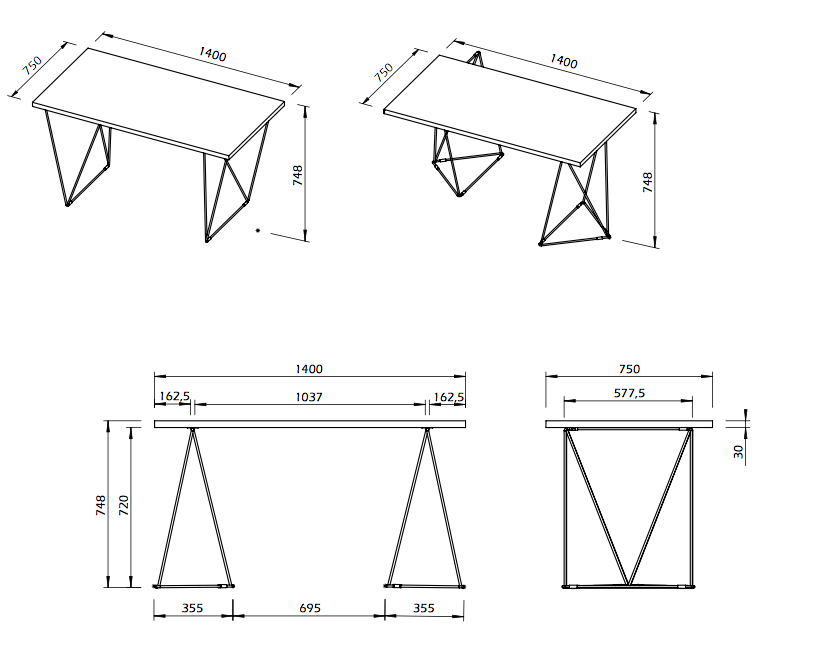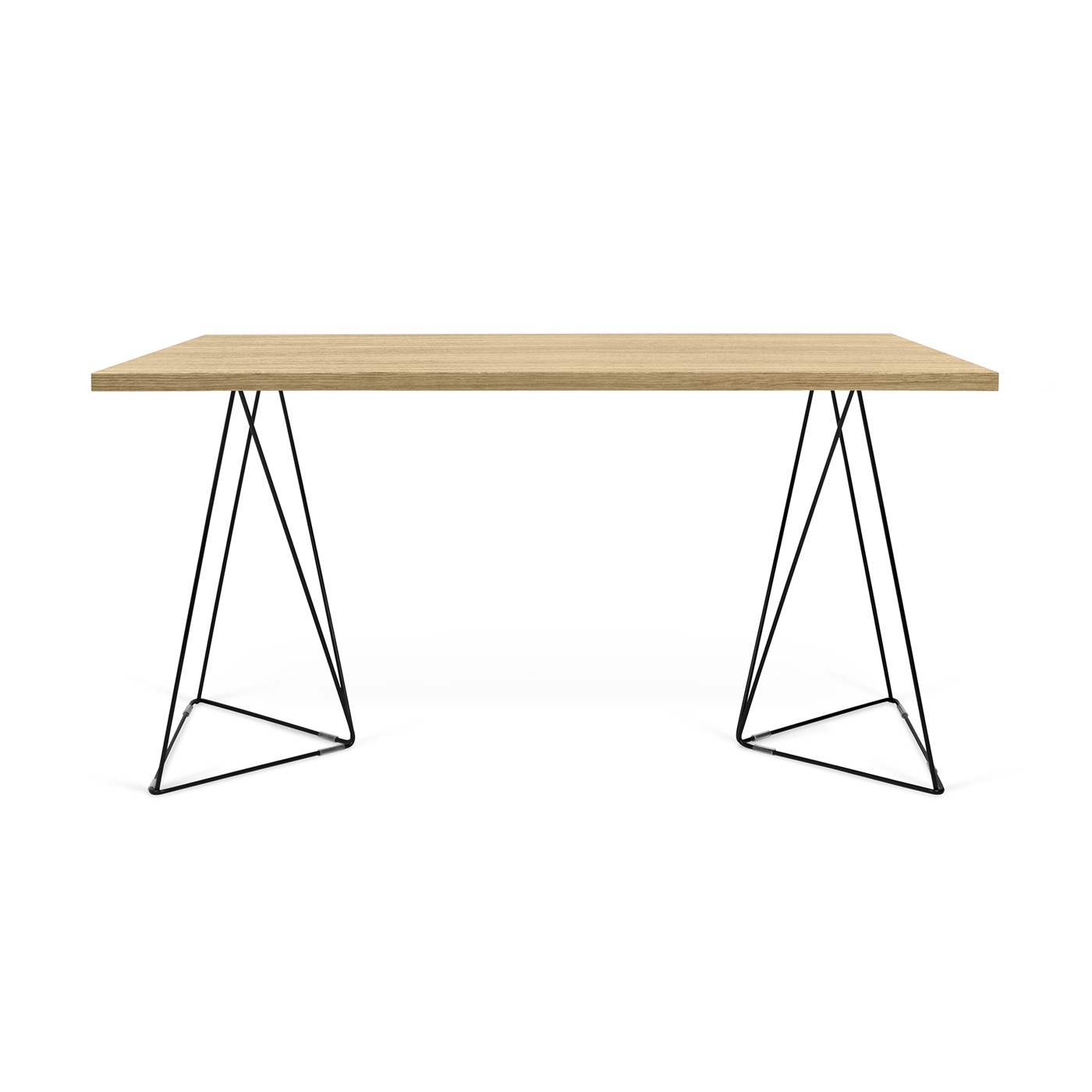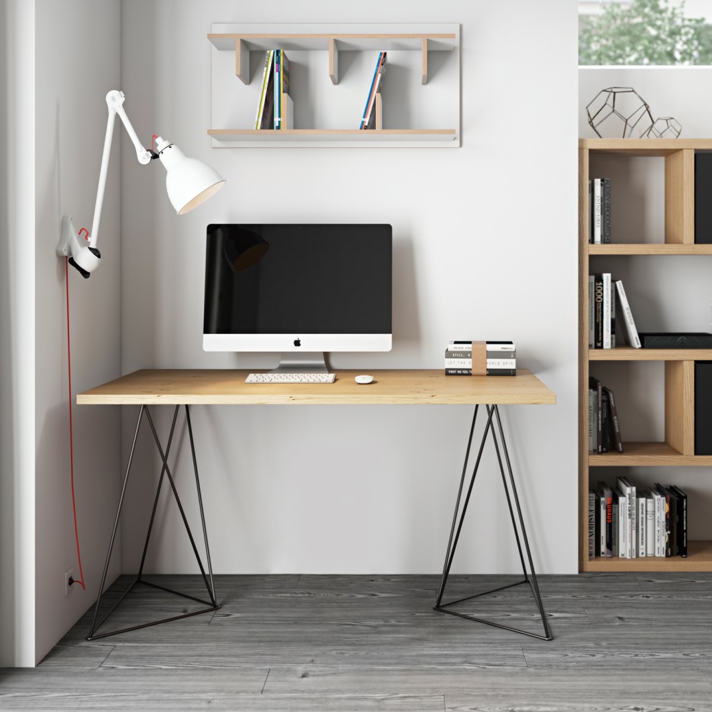Esta secretária oferece um tampo redimensionado para escritório e uma espessura visualmente mais leve, possibilitando a integração de cavaletes metálicos: disponíveis em verde água e preto, com um tampo em carvalho selvagem, ou lacado a branco com o detalhe da orla em plywood.