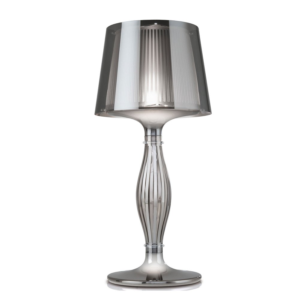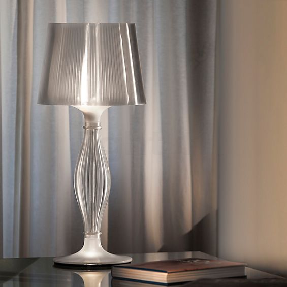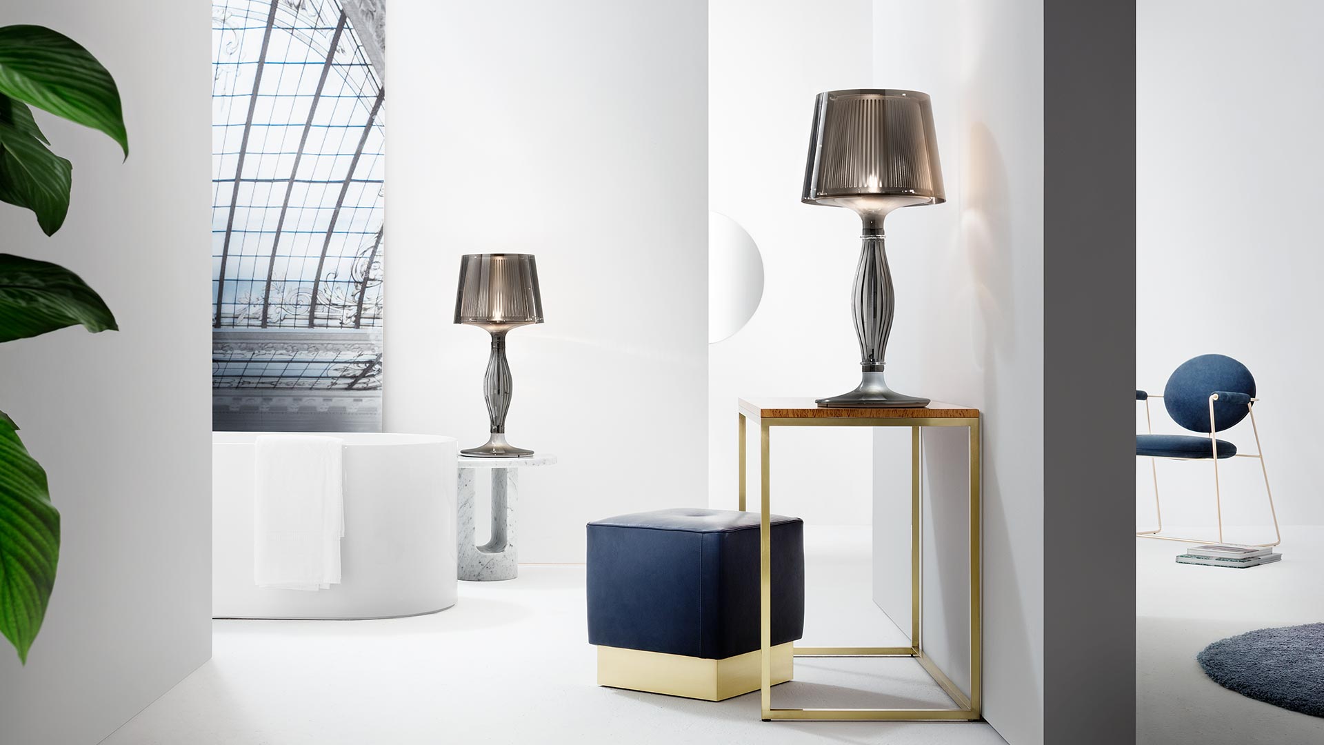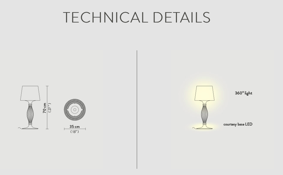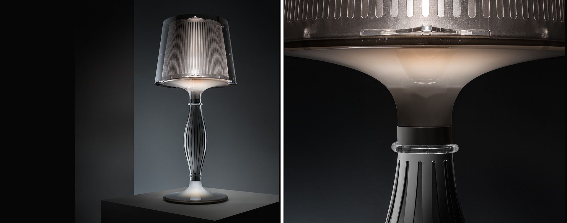 LIZA: um candeeiro de mesa fascinante de inspiração barroca que une um desenho tradicional com o uso de tecnopolímeros de vidro. Com sistema de iluminação duplo, LED de cortesia na sua base e uma luz mais intensa no topo o LIZA transforma-se num projector de luzes e sombras.