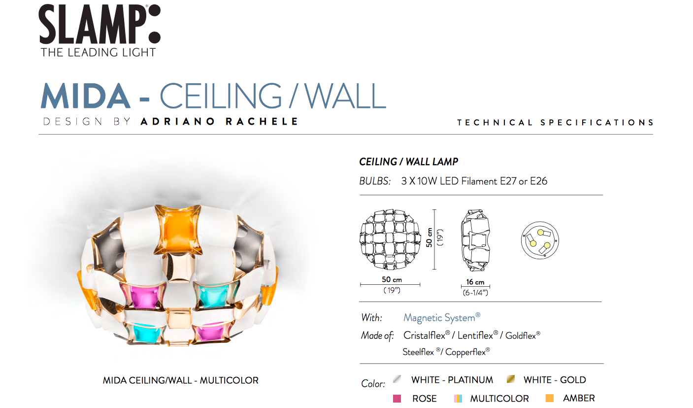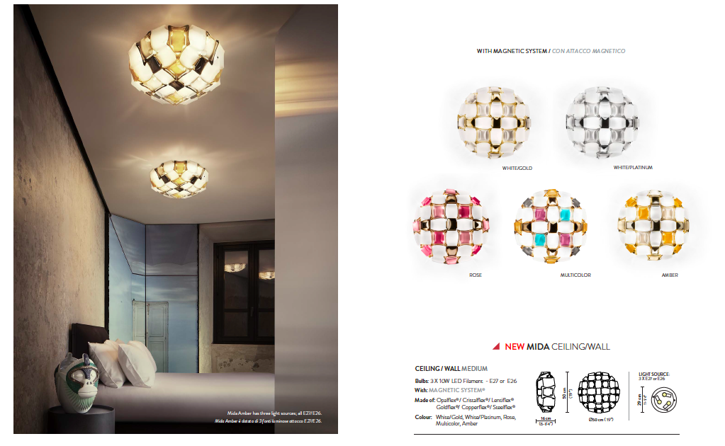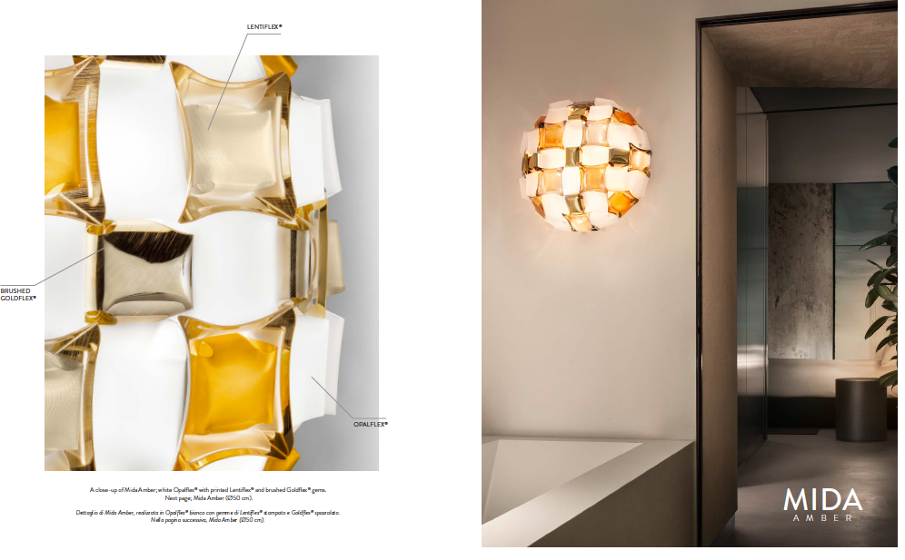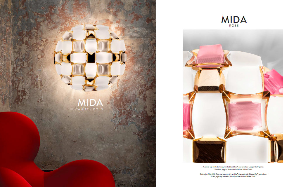 Inspirado pelo mundo da joalharia e da alta costura o MIDA é um candeeiro fascinante. Disponível em 5 tonalidades diferentes, feito integralmente à mão com Opalflex® e Lentiflex® impresso.