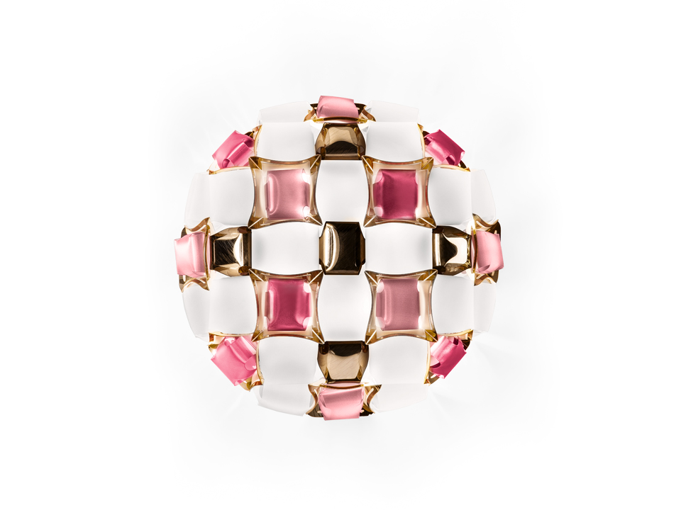 • Pendente decorativo redondo em vidro fosco branco, vidro rosa e metal dourado