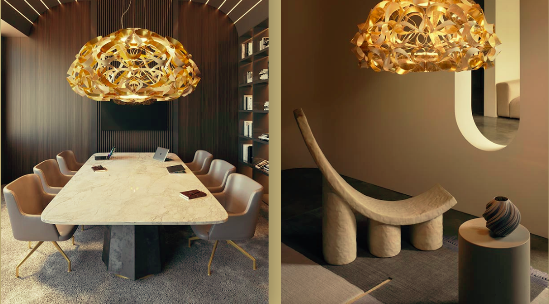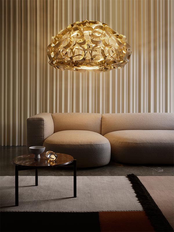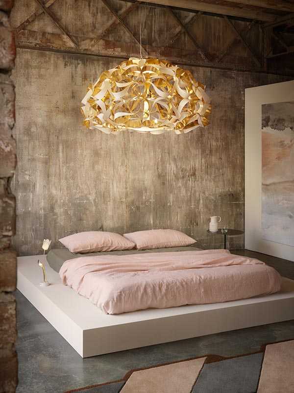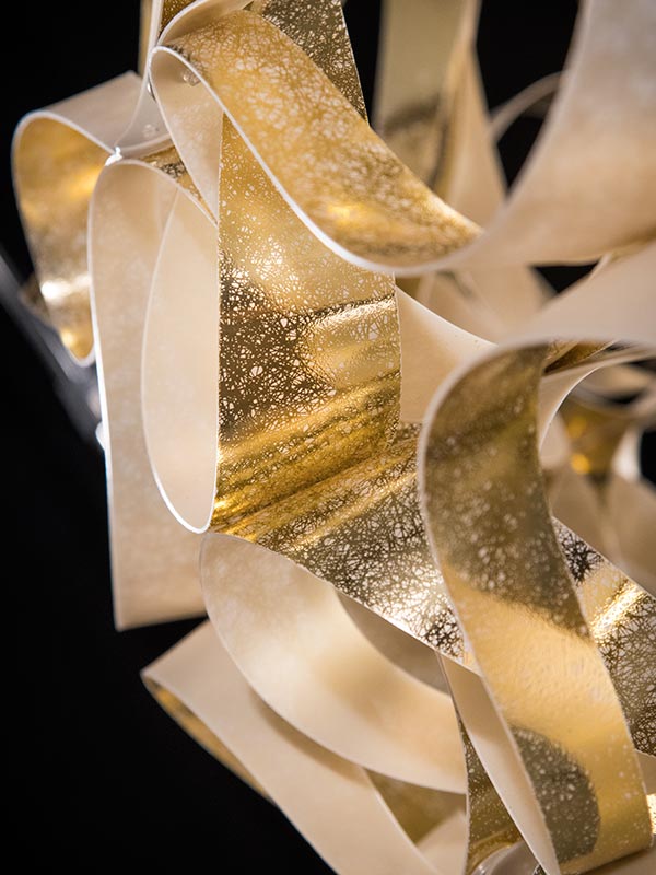 A suspensão Quantica é inspirada na união de elementos cósmico. A luz interage com a forma entregado uma forma esculpida e sublime perfeita para todos os espaços O efeito têxtil dourado poduzido com tecnopolímeros de vidro é cortado a frio e depois integralmente montado à mão.
