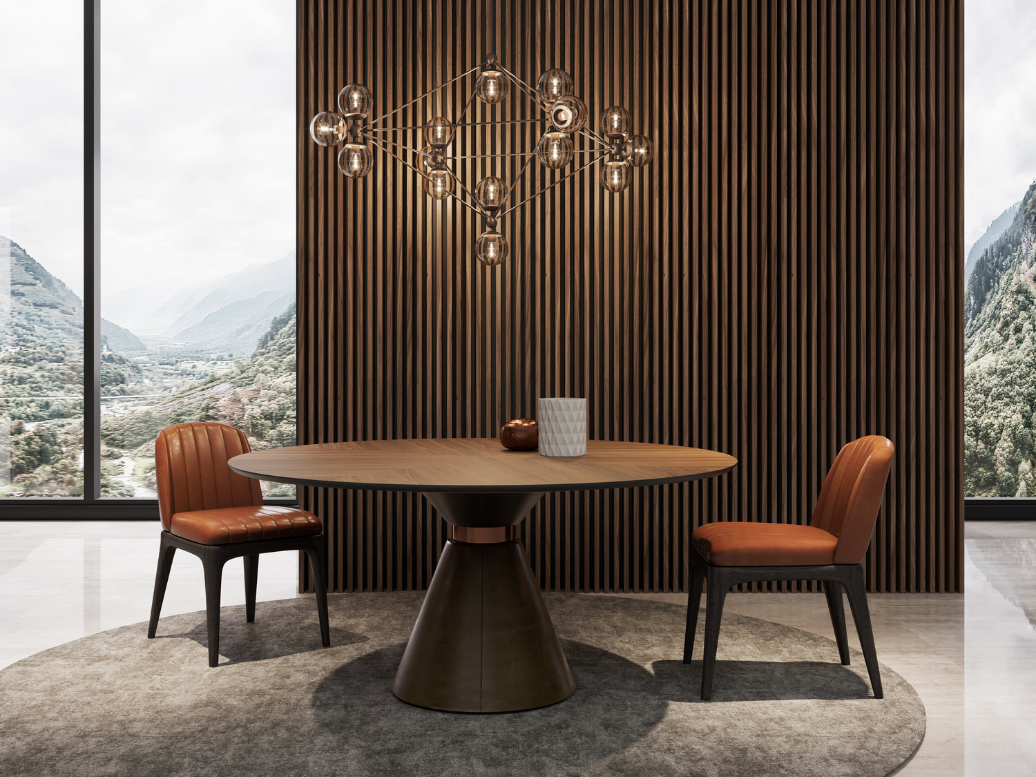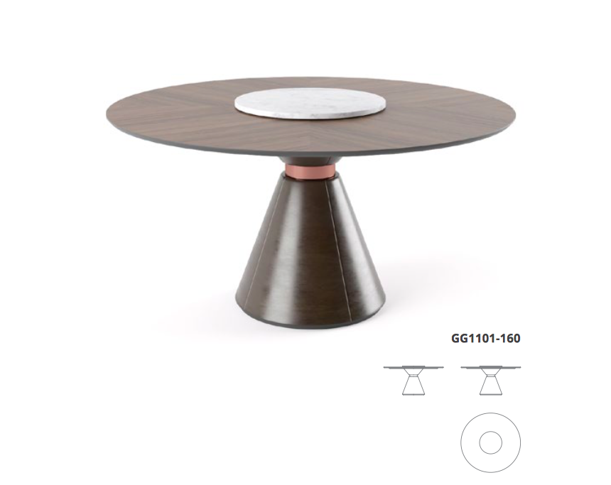Mesa de Jantar redonda. Estrutura em MDF. Pé revestido a pele ou tecido e com incrustação de aplicações de aço inox à cor de cobre. Tampo redondo folheado a nogueira com acabamento a verniz poliuretano. Opção de prato rotativo “Lazy Susan” em mármore branco.