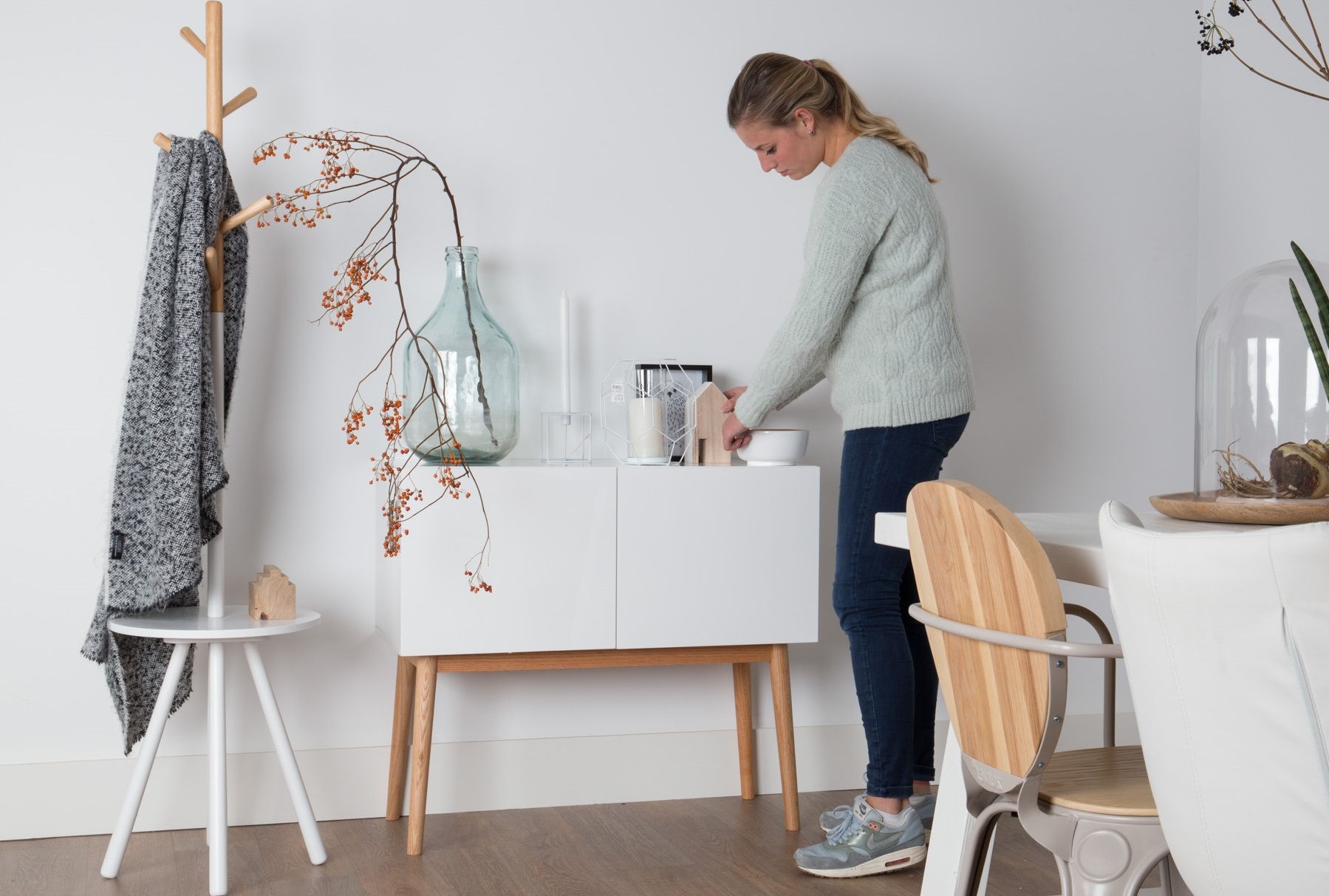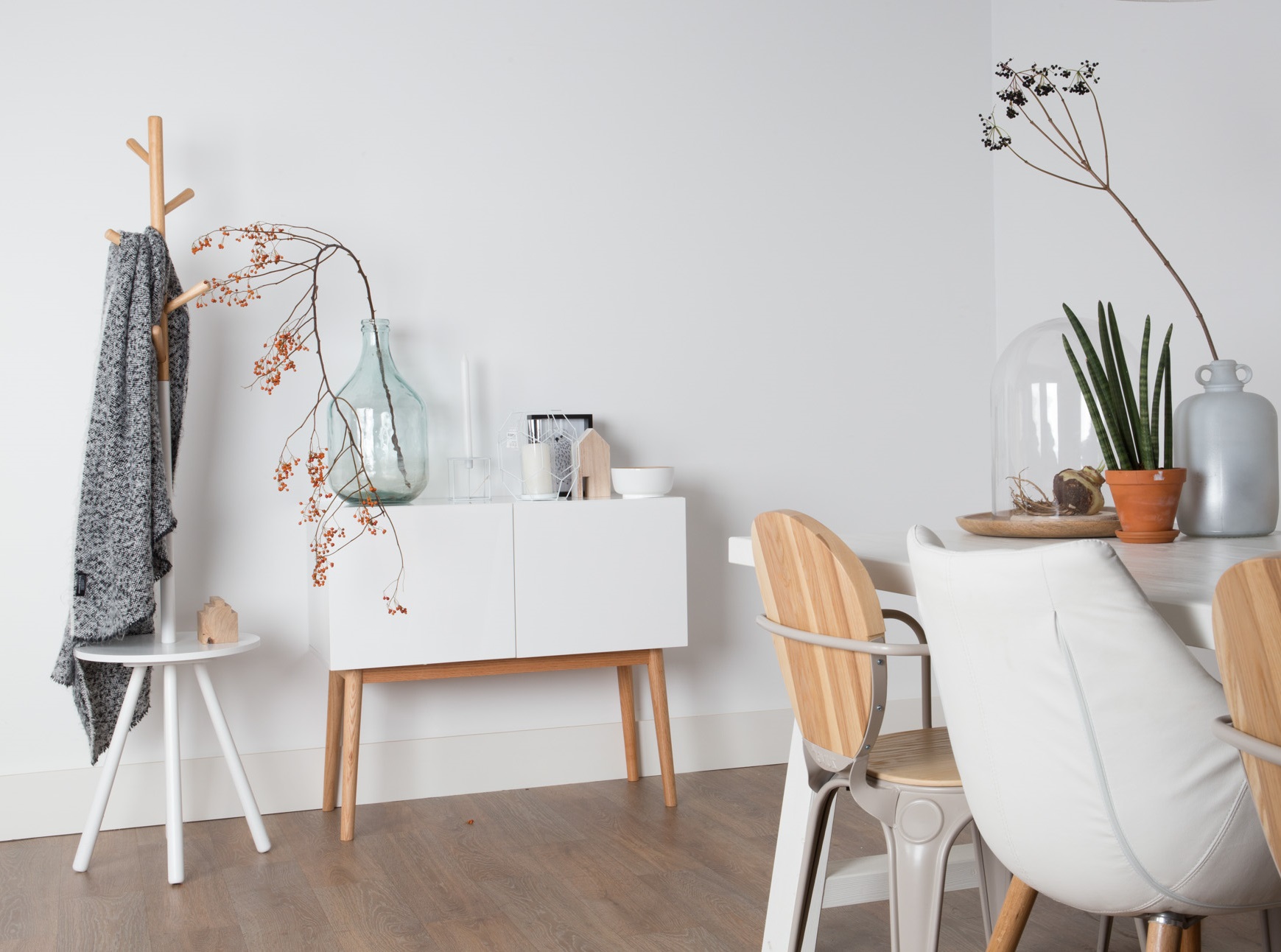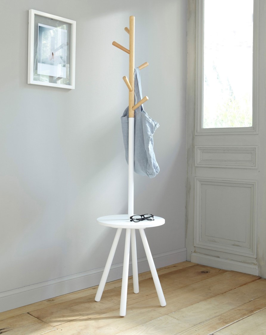 Adoramos móveis multifuncionais. O TABLE TREE não é só um simples cabide para colocar os seus casacos e lenços, também será o sitio ideal para deixar, chaves, carteiras ou telemóvel. Revestimento de madeira (5 ganchos) com 15 milímetros tampo da mesa MDF. Combinação de acabamento natural e branco.