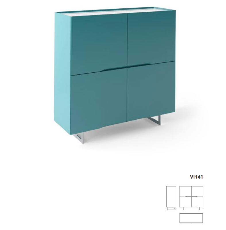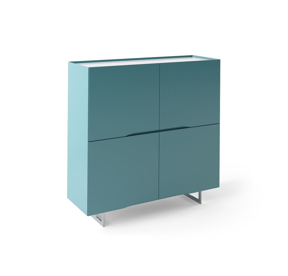 Móvel bar de 4 portas com 4 prateleiras interiores (uma de vidro). Pés em inox. Tampo em vidro lacado, vidro impresso, folhaedo, cerâmica ou fénix. Estrutura em MDF com acabamento lacado mate ou alto brilho. Disponível em diversas configurações.