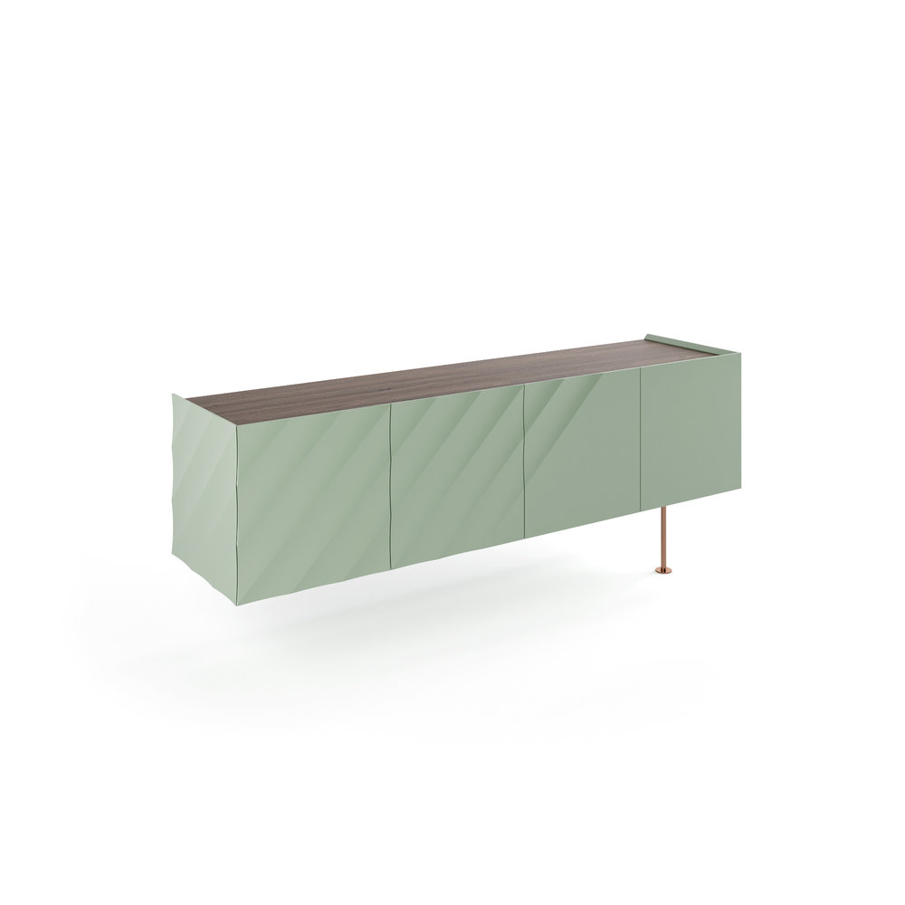 Aparador com estrutura em MDF e folheado de madeira, com 2 portas de correr em fole e uma gaveta interior. Pé em ferro banhado a cobre e acabamento em verniz ou lacado. Disponível em várias configurações. Consulte-nos para mais informações.